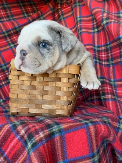 Щенок цветного английского бульдога, мальчик. Окрас бело-лиловый мерль. Документы АВKC. Привит по возрасту. Озорной, чудесный мальчик ищет своих маму и папу.